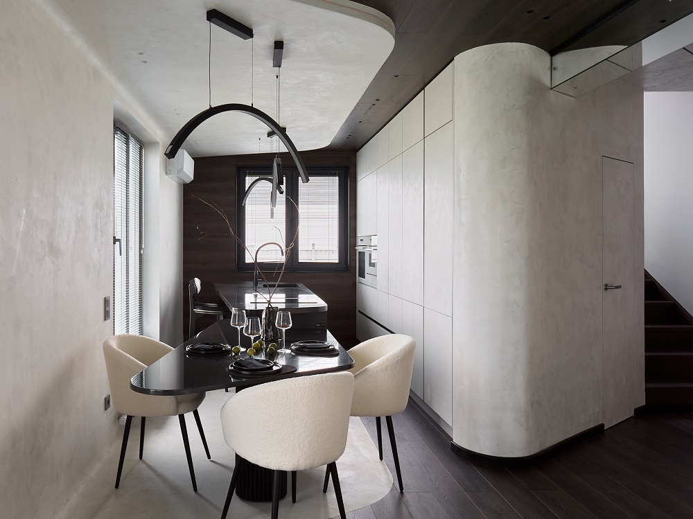 Дизайн-студия BALKA.Studio воссоздали на кухне героев выпуска атмосферу бизнес-класса самолета — получился эргономичный интерьер с обтекаемыми формами, высоким уровнем сервиса в зоне готовки и пространством для мягкой посадки в зоне отдыха.