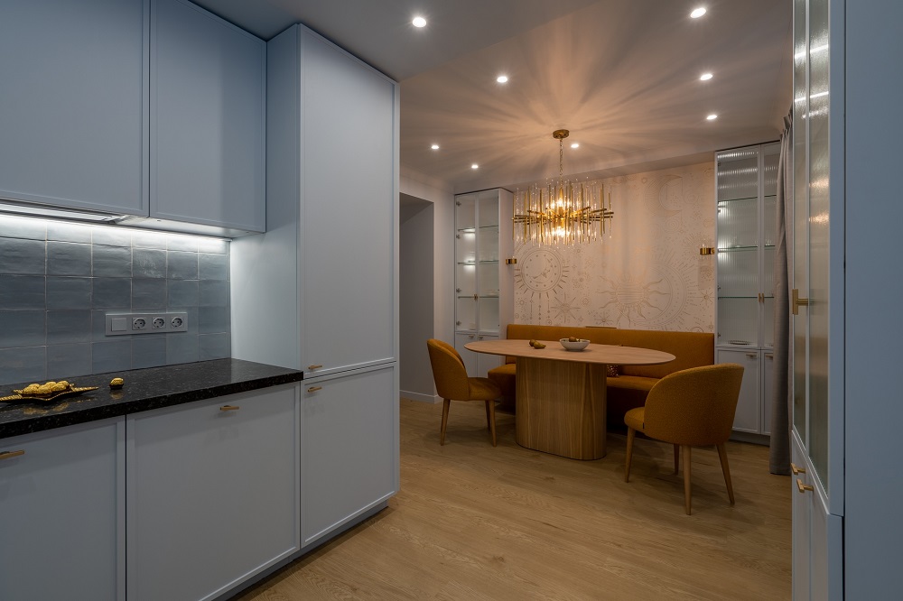 В этом проекте дизайнер «Квартирного вопроса» Татьяна Казанцева активно работала с цветом и светом, чтобы создать уникальное тёплое пространство со сложной архитектурой, но простой эргономикой.
